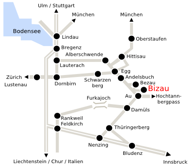 Bregenz - Bizau auf der L200 ca. 45 km.